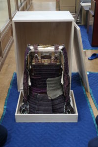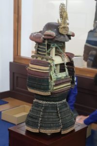 修理しておりました重要文化財「黄地平絹流水梅扇面描絵胴服きじへいけんりゅうすいばいせんめんかきえどうふく」「白地雲竜平絹彩色陣羽織しろじうんりゅうへいけんさいしきじんばおり」「茶地竹雀丸文綾片身替胴服ちゃじたけにすずめまるもんあやかたみがわりどうふく」「金銀襴緞子等縫合胴服きんぎんらんどんすとうぬいあわせどうふく」が帰ってまいりました。