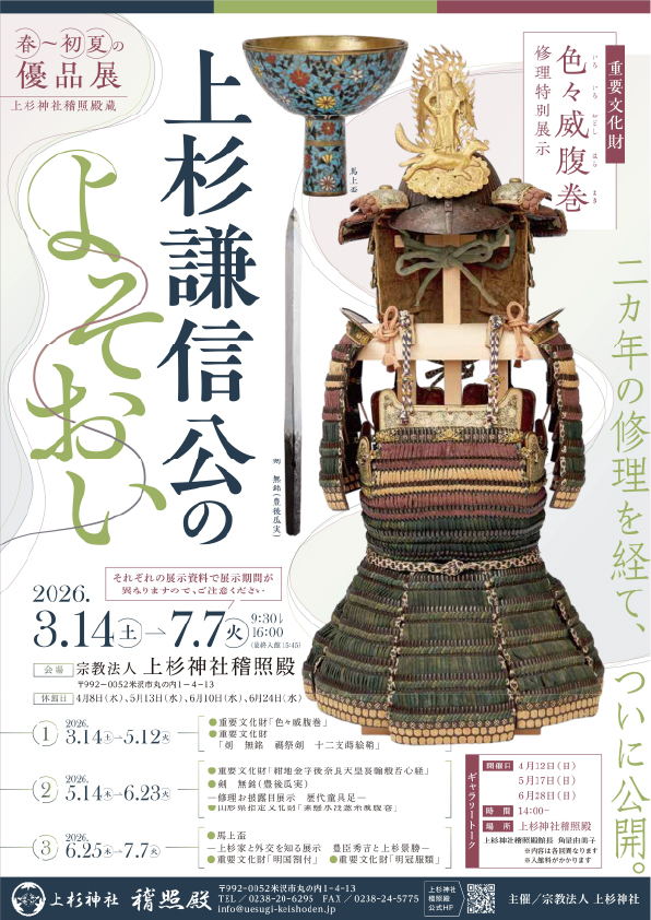 稽照殿 春~初夏の優品展 上杉謙信公のよそおい 投稿者: 上杉神社 稽照殿催し 稽照殿では令8年3月14日(土)~7月7日(火)の期間中【春~初夏の優品展 上杉謙信公のよそおい 上杉神社稽照殿蔵 重要文化財「色々威腹巻」修理特別展示】を開催いたします。 ■現在の展示品のご案内(一部)■【重要文化財】色々威腹巻【重要文化財】剣 無銘 禡祭剣 十二支蒔絵鞘【重要文化財】白地綾はぐま毛付陣羽織(3月14日(土)から4月7日(火)まで)水晶イラダカ数珠大太刀 行光大太刀 銘 備州長船盛重 文正元年二月日 その他、多数展示しております。 ギャラリートーク 学芸員による展示解説を行います。お申込みは不要です。開 催 日 4月12日(日)、5月17日(日)、6月28日(日) ※各回14:00~開催時刻. 14:00~参 加 費 無料 ※要入館料解 説 員 稽照殿館長 角屋 由美子 開館時間・入館料等に関しましてはこちらをご覧ください。皆様のご来館をお待ちしております。